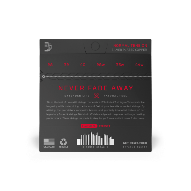 Le XT sono le nostre corde per strumenti classici più resistenti, dato che uniscono l'esperienza centenaria di D'Addario alla moderna tecnologia usata per il rivestimento. Le corde dei bassi Dynacore di questa muta XT usano un'anima in nylon multifilamento realizzata con una tecnica rivoluzionaria che si distingue per una stabilità di intonazione impareggiabile, un attacco reattivo e una proiezione sonora definita; e grazie al nostro rivestimento proprietario XT, anche per una durata notevolmente superiore. Abbinate ai nostri cantini di precisione al titanio, bilanciati e dalla risonanza superiore, le XT Dynacore sono le corde per strumenti acustici più avanzate disponibili sul mercato. Questa muta dalla tensione normale è la più venduta, preferita da molti per il perfetto bilanciamento tra un timbro sontuoso, comfort esecutivo e proiezione sonora dinamica.