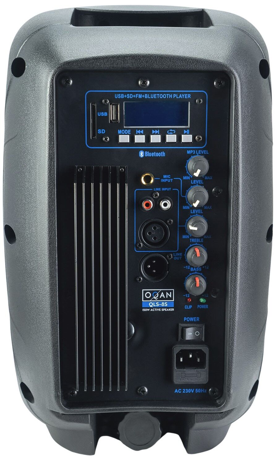 Cassa attiva 8 inch. 200 Watt. 200 Watt Bassi Classe D. 50 Watt Alti. 2 bande di equalizzazione. Mic In. Aux in. Controllo di volume per singolo In. Bluetooth, SD, USB MP3 player. Radio FM. Telecomando ad infrarossi.